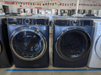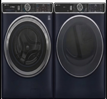GE Profile 5.3cu.ft. Smart Front Load Washer in Sapphire Blue w/OdorBlock UltraFresh Vent system/GE Profile 7.8 cu.ft. vented Gas Dryer in Sapphire Blue with Steam and Sanitize Cycle.